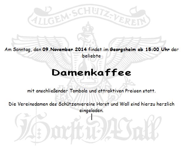 Die Vereinsdamen des Schützenvereins Horst und Wall sind hierzu herzlich eingeladen. Kaffeekarten werden durch den Vorstand des Schützenvereins verteilt.
