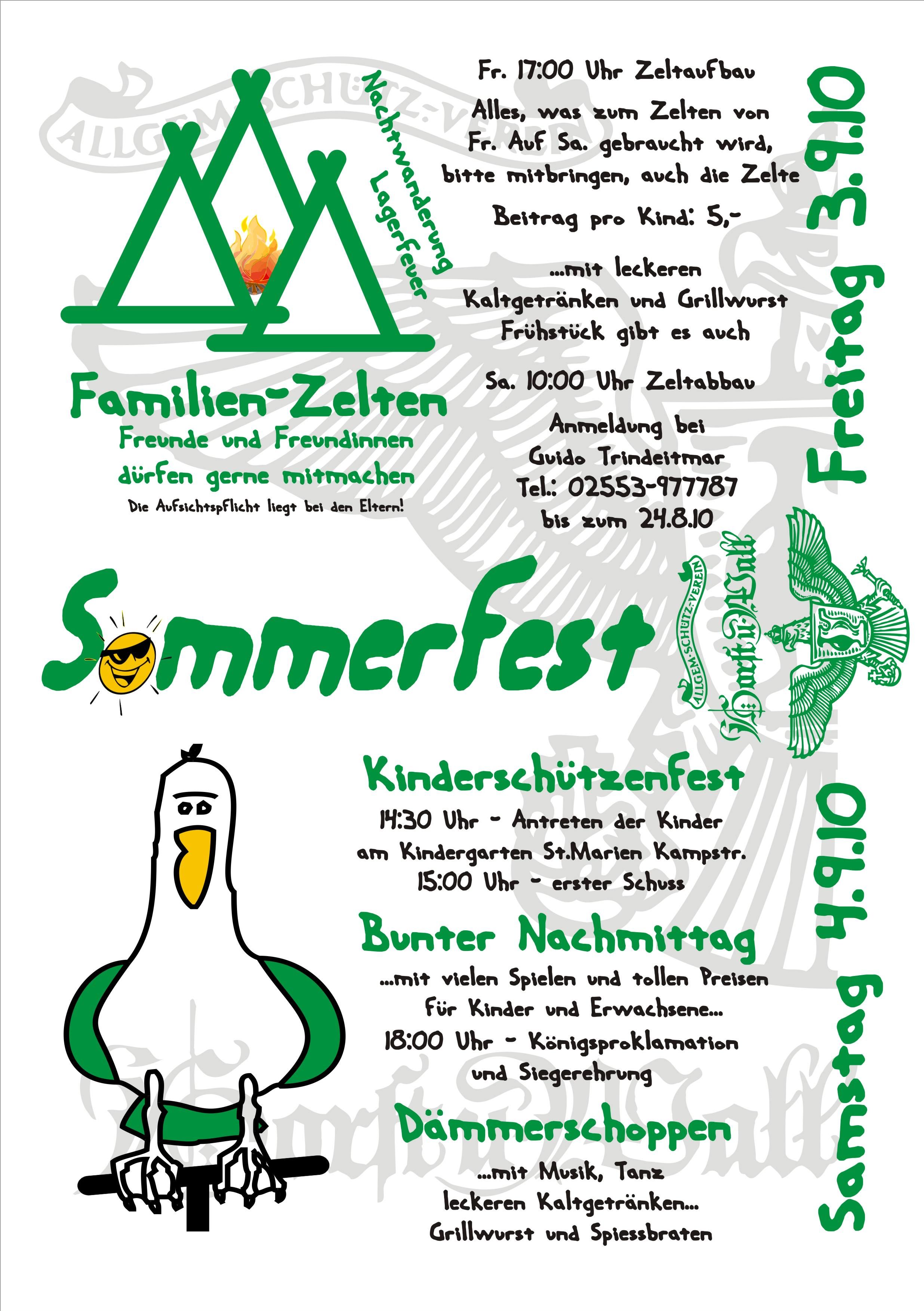 Das von Horst und Wall veranstaltete diesjährige Sommerfest am Samstag , den 1.September , wurde von den Vereinsmitgliedern und deren Familien gut angenommen und war gut besucht. Der Samstag-Nachmittag gestaltete sich kurzweilig für Jung und Junggebliebene. Um 14:30 Uhr trafen sich die Kinder am Kindergarten in der Kampstraße. Begleitet durch den Spielmannszug Nachtigallen zogen sie zum Schützenplatz an der Schützenstraße. Es schloss sich ein bunter Nachmittag mit vielen Spielen und tollen Preisen an. Parallel fand das Schießen um die Würde des Kinder-Schützenkönigs statt. Nele Bagert bezwang nach zähem und lang andauerndem Schießen den sich hartnäckig wehrenden Vogel. Zum Mitregenten für die nächsten beiden Jahre erwählte sie Leonard Winter. Sie lösten das alte Kinder-Königspaar Torben Bagert und Amell Linekamp ab. Die Proklamation und die Garatulation wurde durch den amtierenden Schützenkönig Jürgen Ultee durchgeführt. Beim Vereins- Preisschießen wurde Benedikt Pleie Sieger. Oliver Rohling wurde Zweiter. Den dritten Platz belegte Magnus Hesping. Mit Musik und Tanz wurde das Fest mit einem Dämmerschoppen bis in den frühen Sonntagmorgen fortgesetzt.